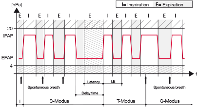 The device generates two pressure levels in the S-, ST- or T–mode via an electrically controlled turbine. Switching from one pressure level to another is realized via a quick change of the revolutions of the fitted high-performance blower to keep the stress for the patient as low as possible.