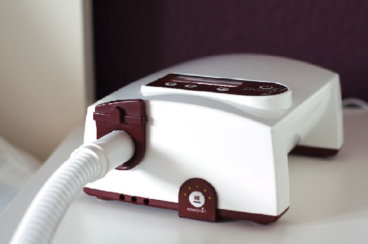 The point 2 CPAP is a therapy device for the treatment of the obstructive sleep anpnea. The device provide a continuous positive pressure. In addition to the CPAP mode the respiration therapy device provides a FLEXLINE mode, an individual respiration flow proportionable pressure adjustment during the inspiration and the pressure drop during the expiration. This intelligent method of the pressure adaptation enables a smooth therapy.